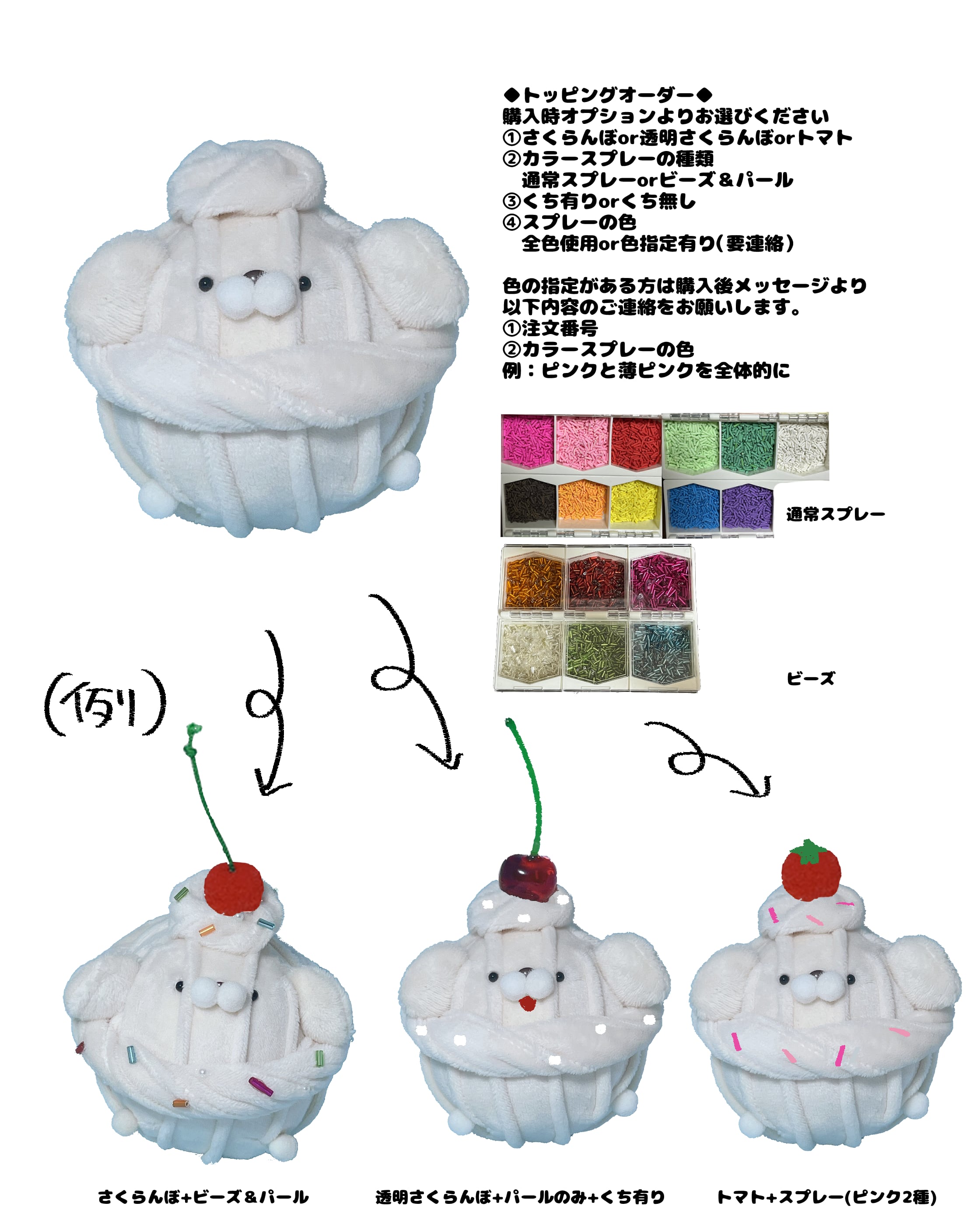 購入時にオプションより①頭のトッピング②カラースプレーの種類③口の有無④スプレーの色をお選びください。